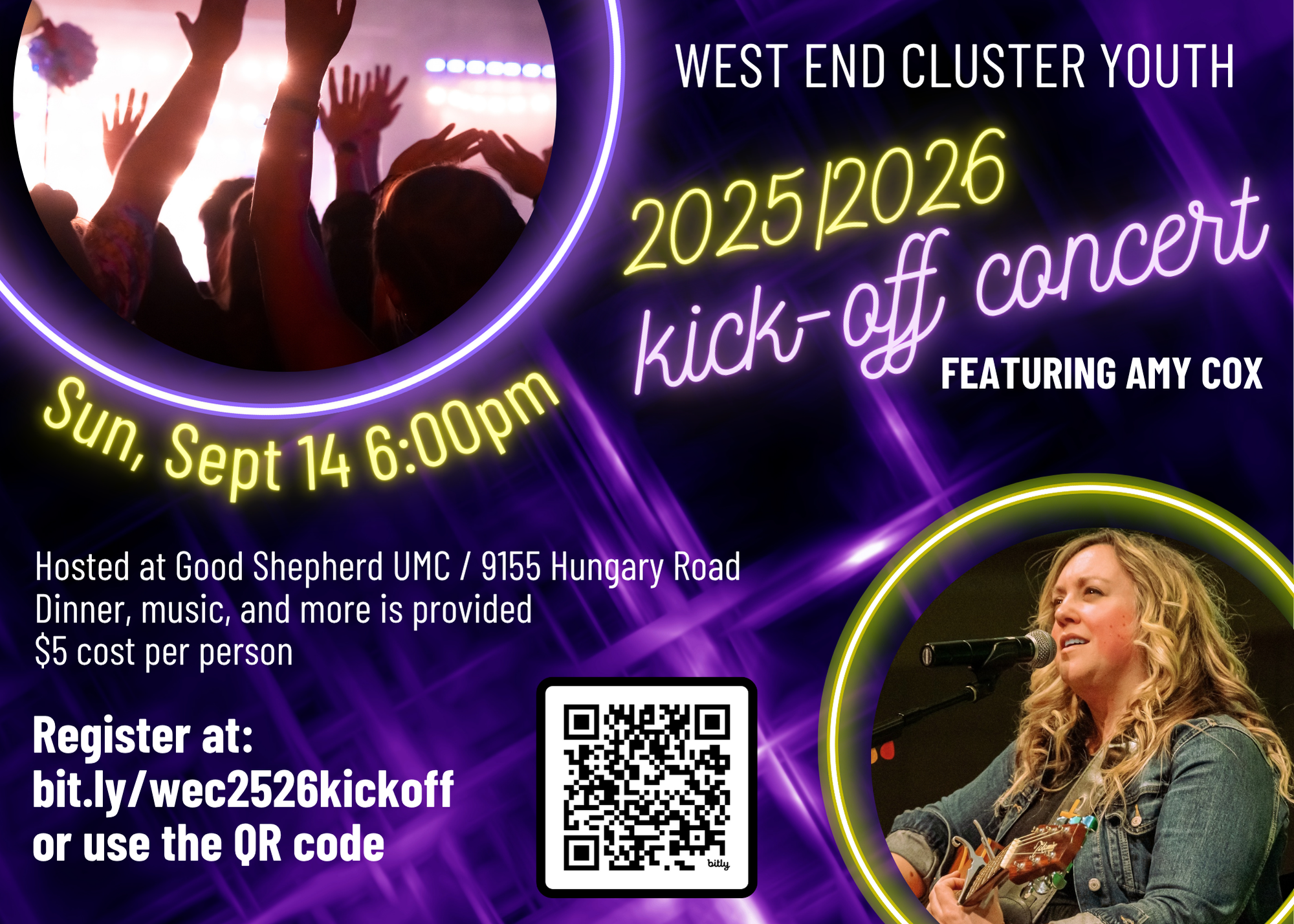Kick off the new ministry year with a night of praise, music, dinner, and fellowship at the West End Cluster Youth Concert, featuring Amy Cox!